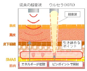 ウルセラは、皮膚の深部にまで効率よく確実に超音波を伝達することにより、リフトアップが体感できる治療器です。